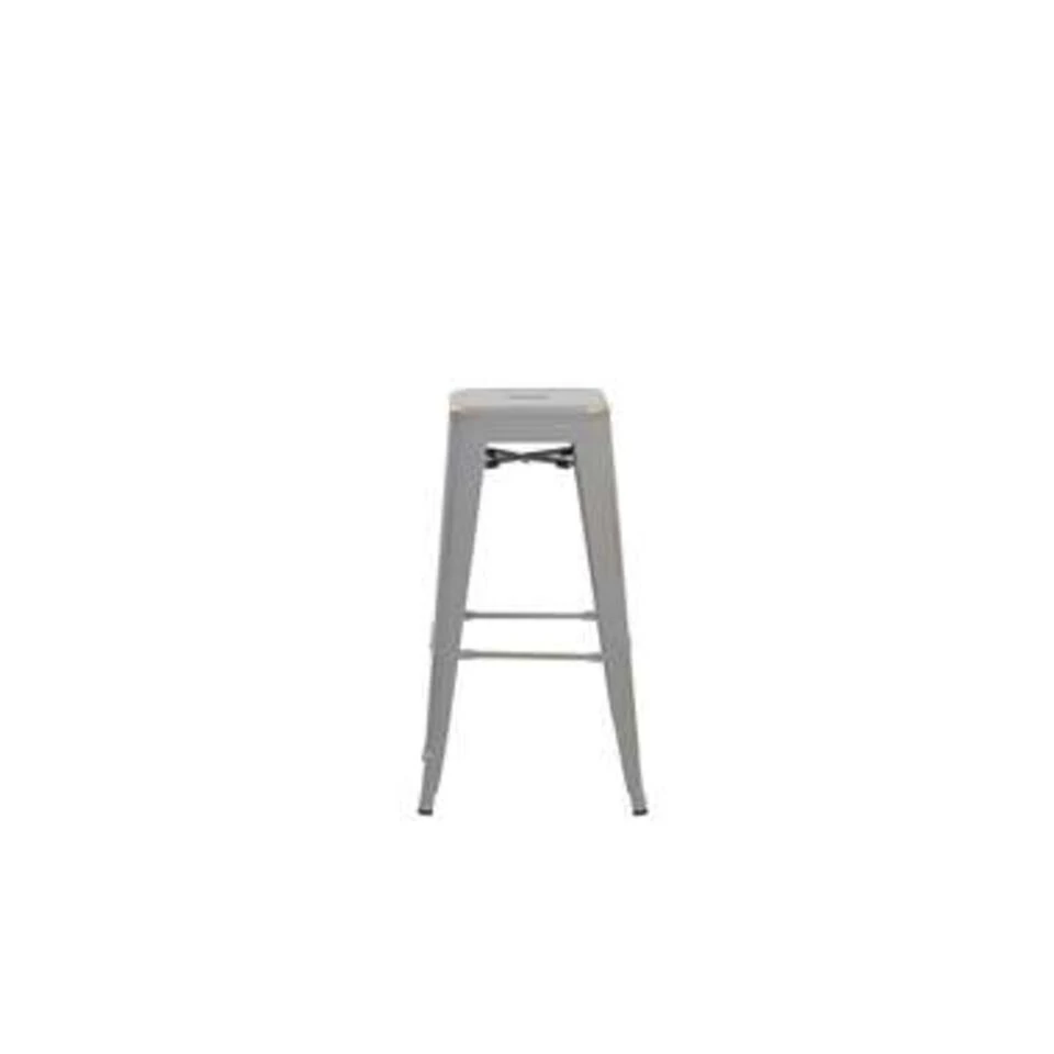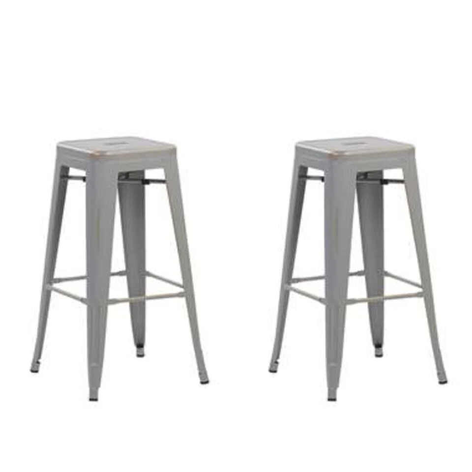 Moderne en praktische barkruk in set van 2. Deze praktische krukken hebben een ideale zithoogte en zijn stapelbaar. Modern design in mat zilver en goud, gecombineerd met functioneel ontwerp van gepoedercoat metaal dat gemakkelijk te onderhouden is. Kunststofknoppen beschermen je vloer en bieden een antislip standaard, dwarsprofielen aan alle vier de zijden dienen als comfortabele voetsteunen.