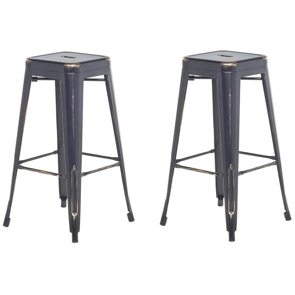 Moderne en praktische barkruk in set van 2. Deze praktische krukken hebben een ideale zithoogte en zijn stapelbaar. Modern design in mat zwart en goud, gecombineerd met functioneel ontwerp van gepoedercoat metaal dat gemakkelijk te onderhouden is. Kunststofknoppen beschermen je vloer en bieden een antislip standaard, dwarsprofielen aan alle vier de zijden dienen als comfortabele voetsteunen.