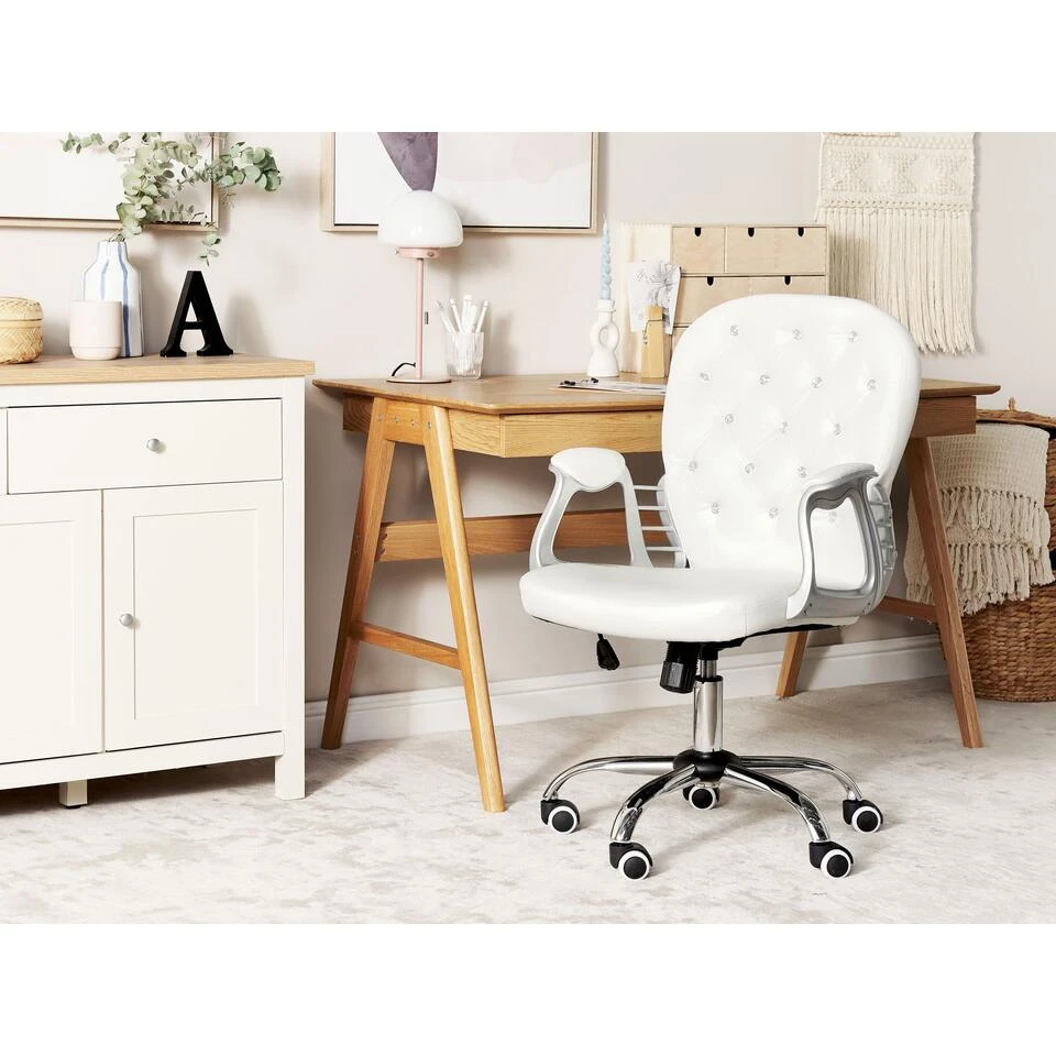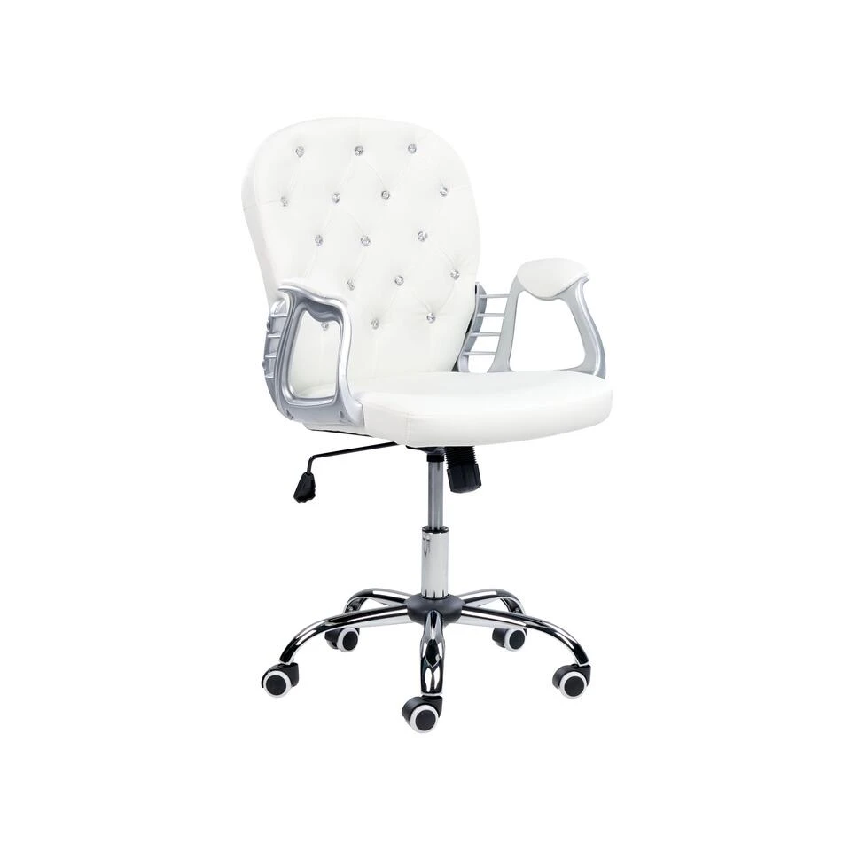 Verstelbare stoel met kristallen getuft. Deze luxe bureaustoel is een voorbeeld van moderne stijl met een vintage twist. De stoel is gestoffeerd in duurzaam kunstleer en heeft een met kristallen getufte rugleuning dat zorgt voor een elegante afwerking. De gebogen en gevulde armleuningen zorgen voor comfort en passen goed bij de stoffering. Het ingebouwde draai mechanisme en de gaslift zorgen ervoor dat je de stoel volledig aan jouw wensen kan aanpassen. De stoel is perfect voor in verschillende kamers van werkkamer tot kinderkamer.