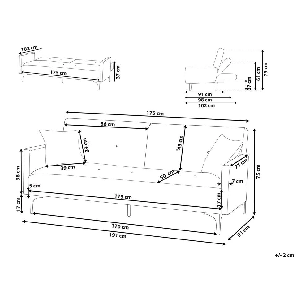 Belangrijkste eigenschappen: Zeer gemakkelijk te veranderen in een bed, Rugleuning verstelbaar in 3 posities, Traditioneel design met een moderne twist, Hoogwaardige kwaliteit stoffering, Verwijderbare kussenhoezen, Beschermdoppen voor oppervlaktebescherming