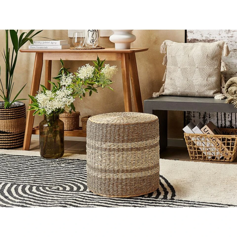 Handgeweven ronde poef. Verfraai de uitstraling van je woon- of slaapkamer met deze uitzonderlijke extra zitplaats. Dit product is handgeweven van natuurlijke materialen en past uitstekend bij veel interieurontwerpen. Het stuk is multifunctioneel, naast een poef kan het ook dienst doen als voetenbankje. Bovendien kan dit meubel dankzij de stabiele constructie en het platte blad ook als bijzettafel worden gebruikt.