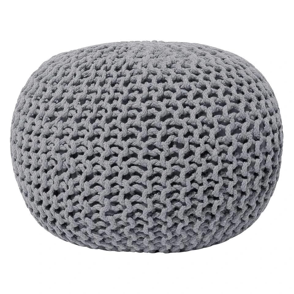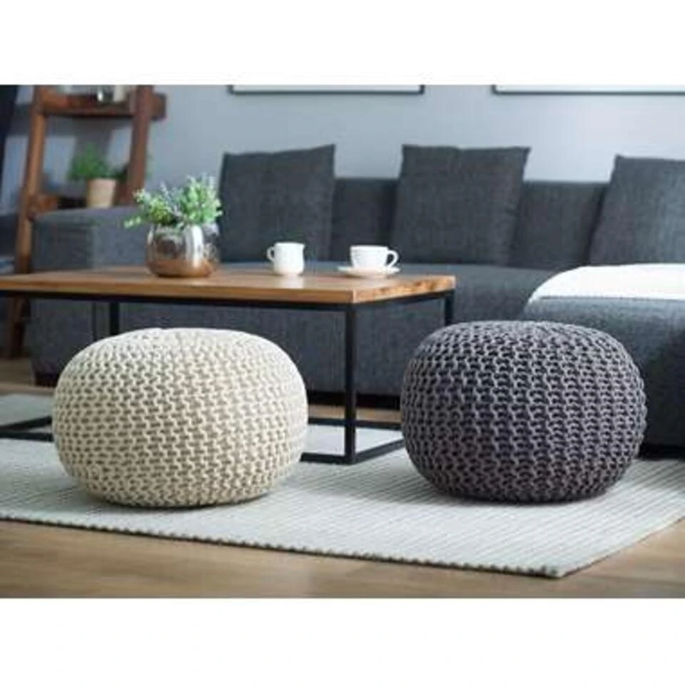 Donkergrijze katoenen poef. Als je op zoek bent naar een vrolijk accent om je interieur op te vrolijken, dan is deze schattige gebreide ronde poef perfect. Met dik weefsel in een warme kleur en stevige, hoogwaardige vulling, kan het dienen als voetenbank, als basis voor een tafeltje of gewoon als decoratief stuk – de mogelijkheden zijn eindeloos. Wees creatief met het mixen van kleuren en maten om een ideale compositie voor je woonruimte te maken en geniet van de charmante moderne sfeer.