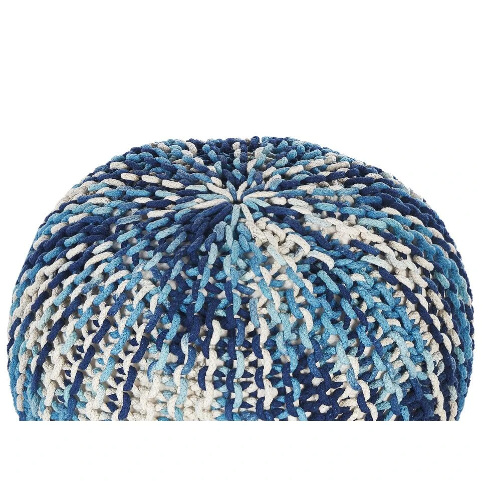 Katoen gebreide ronde poef. Als je op zoek bent naar een vrolijk accent om je interieur op te vrolijken, dan is deze schattige gebreide ronde poef perfect. Met een dik weefsel in verweven wit- en blauwtinten en stevige, hoogwaardige vulling, kan het dienen als voetenbankje, als basis voor een koffieblad of gewoon als decoratief stuk – de mogelijkheden zijn eindeloos. Wees creatief met het mixen van kleuren en maten om een ideale compositie voor je woonruimte te maken en geniet van de charmante moderne sfeer.