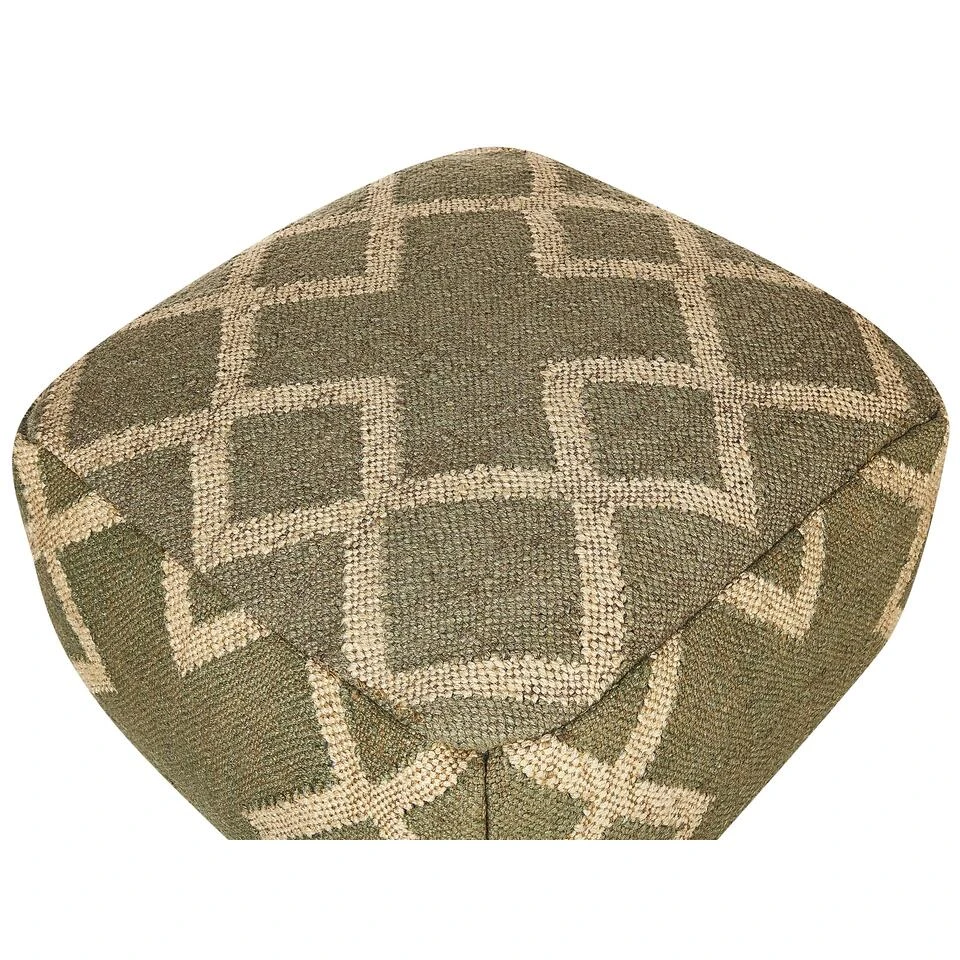 Handgeweven poef in kelimstijl. Deze kubusvormige poef brengt een natuurlijke flair in je interieur. Het is op maat gemaakt met een jute en wollen bekleding in een eenvoudig geometrisch patroon, en past daarom goed in Scandinavische en minimalistische ruimtes. Omdat de hoes met de hand wordt gemaakt met behulp van een traditionele Indiase weeftechniek genaamd Panja, is elk stuk uniek. Style hem in elke ruimte, als extra zitplaats of functioneel decoratief accent.
