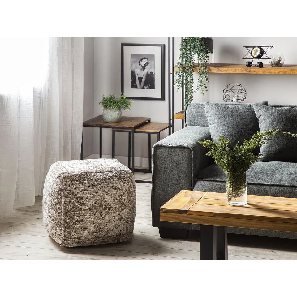 Rechthoekige poef met grijstonen. Deze mooi gevormde poef met een uniek patroon in subtiel grijs is de perfecte metgezel voor elke woonkamer en slaapkamer. Het tijdloze ontwerp past zich prachtig aan aan verschillende interieurontwerpen en is universeel toepasbaar als stoel, voetenbank of als decoratieve toevoeging aan jouw woonkamer.