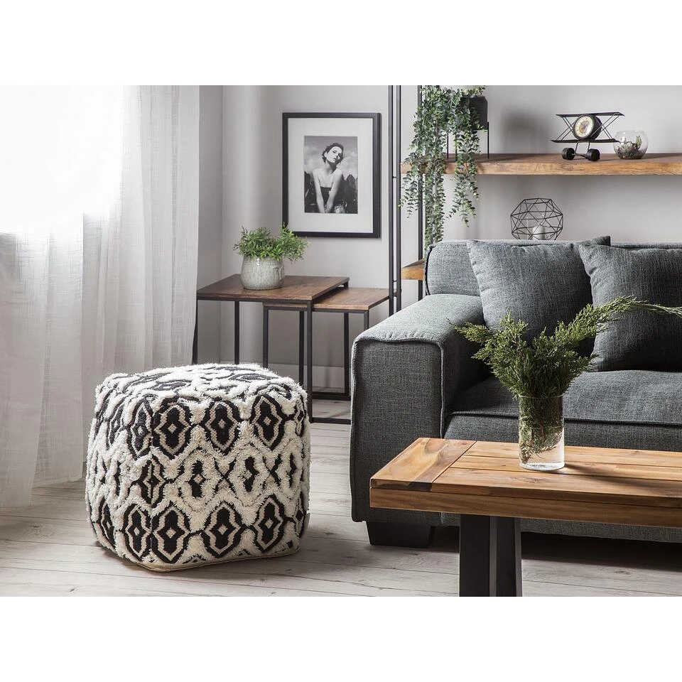 Rechthoekige poef met zwart-wit patroon. Een boho-geïnspireerde poef met een oosterse flair, dit is een gedurfd accentstuk dat een aanvulling vormt op elk traditioneel of Scandinavisch interieur. Door wol en katoen te combineren in een eigenaardig zwart-wit patroon, is het ruig en voelt het zacht aan. De visuele esthetiek van het meubilair voegt diepte toe aan het totale ontwerp en wordt aangevuld met een hypoallergene EPS-bolletjesvulling. Dit maakt de poef ook stabiel, wat betekent dat het meubel kan worden gebruikt als bijzet- of salontafel.