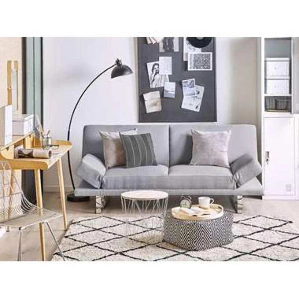 Trendy slaapbank. Een strakke en comfortabele slaapbank is een essentieel onderdeel van je huis, vooral in kleine woonruimtes. Bekleed met hoogwaardig polyester, dat zacht aanvoelt en gemakkelijk te onderhouden is. Het houten frame en de roestvrijstalen poten garanderen de stevigheid van de bank. Dik gevoerde zitting en rugleuning garanderen een uitzonderlijke zitervaring, terwijl de armleuningen plat kunnen worden gelegd of aangepast aan je behoeften. De bank kan dankzij het klik-klak-mechanisme binnen enkele seconden worden omgebouwd tot een compact bed wanneer je een extra slaapplek nodig hebt.