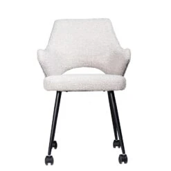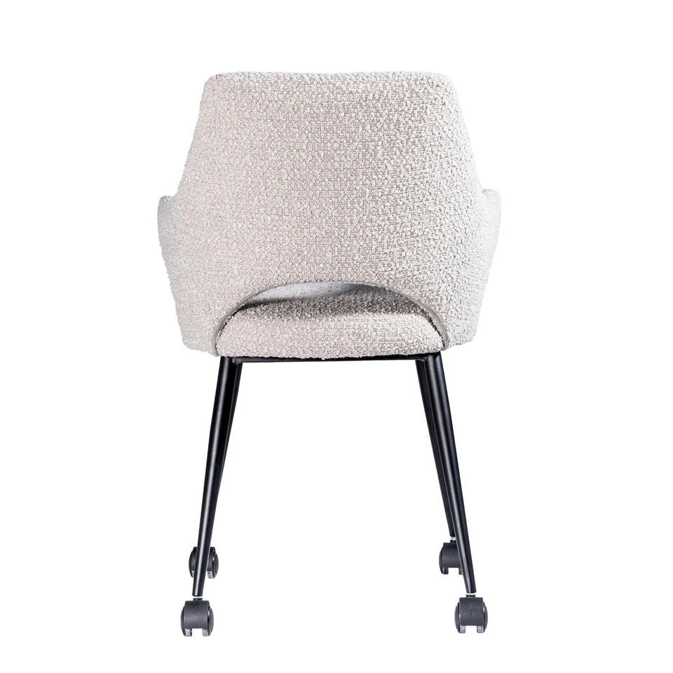 De Eetkamerstoel Jasmine Bouclé is een prachtige toevoeging aan elke eetkamer. De stoel is gemaakt van hoogwaardig bouclé materiaal en heeft een stijlvolle afwerking. Het zitgedeelte is comfortabel en ondersteund door een stevig frame. De Jasmine is perfect voor zowel formele als informele diners en zal zeker indruk maken. Bovendien is de stoel gemakkelijk te onderhouden en eenvoudig te combineren met andere meubels in de kamer. Met de wieltjes kunnen de stoelen makkelijk al rollend verplaatst worden. Kortom, de Eetkamerstoel Jasmine Bouclé is een uitstekende keuze voor wie op zoek is naar een elegante en comfortabele toevoeging aan de eetkamer.