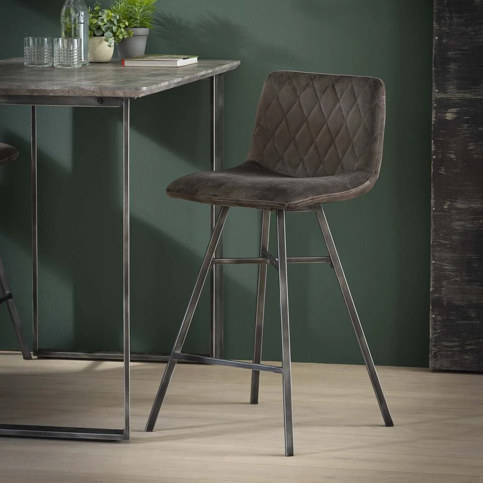 Deze barstoel is een echte must have! De kuip is afgewerkt in een velvet stof met diamondstiksel. Het kruisframe is uitgevoerd in een vintage staal, waardoor de barstoel een stoer karakter krijgt. De barstoel is in twee varianten verkrijgbaar.