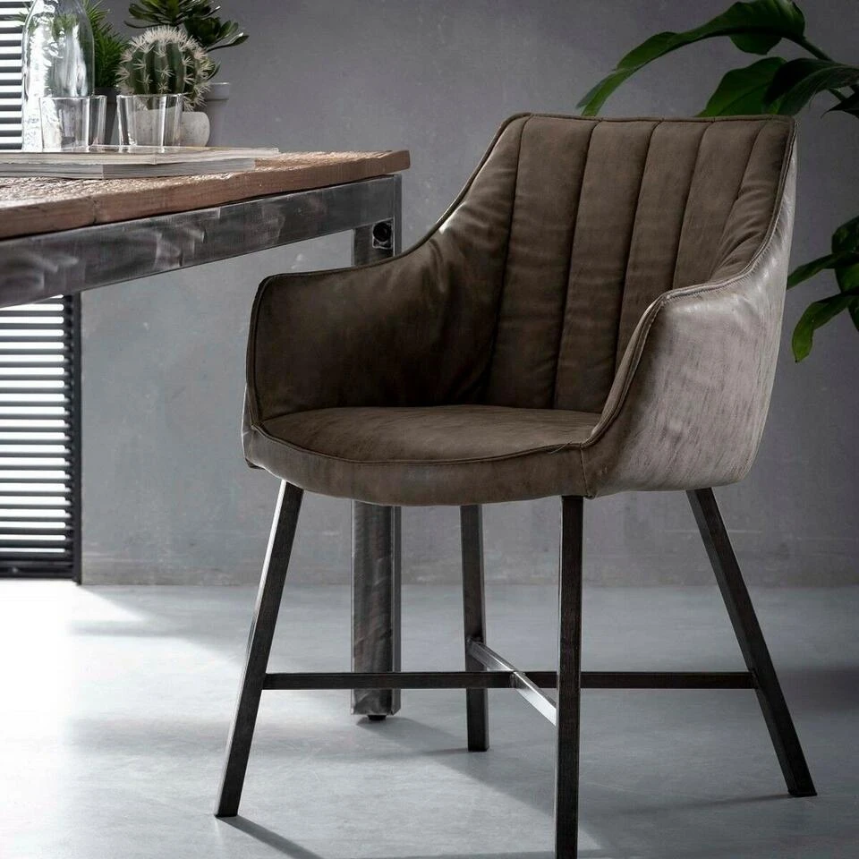 De Newbury eetkamerstoel is een stoere armstoel, welke is voorzien van een wax PU lederen bekleding met verticale stiknaden over de binnenzijde van de rugleuning. Dankzij de comfortabele kuipvorm en armleuningen, zit deze stoel zeer comfortabel. Om hem helemaal af te maken is het onderstel gemaakt van zwart geschuurd RVS. Eetkamerstoel Newbury is verkrijgbaar in het bruin, taupe en zwart en wordt verkocht per set van twee stuks.