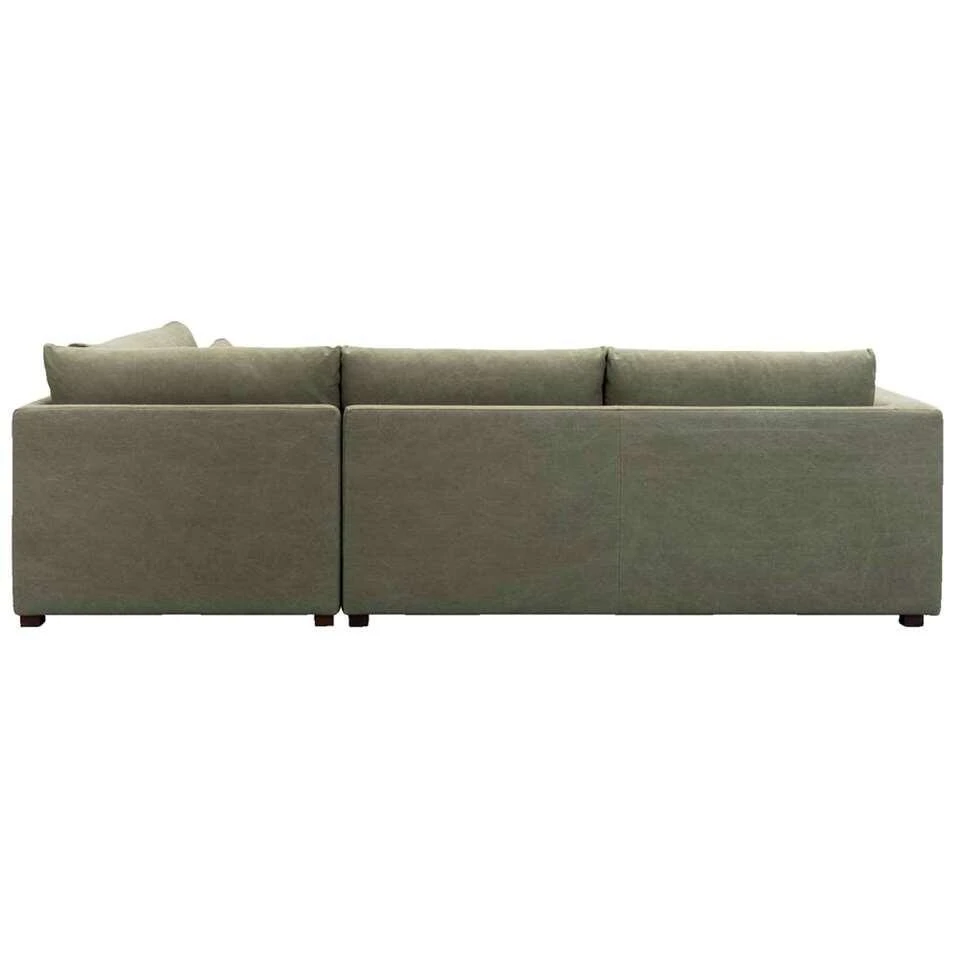 Deze bank is gestoffeerd met stof Bavo in de kleur olijfgroen.
