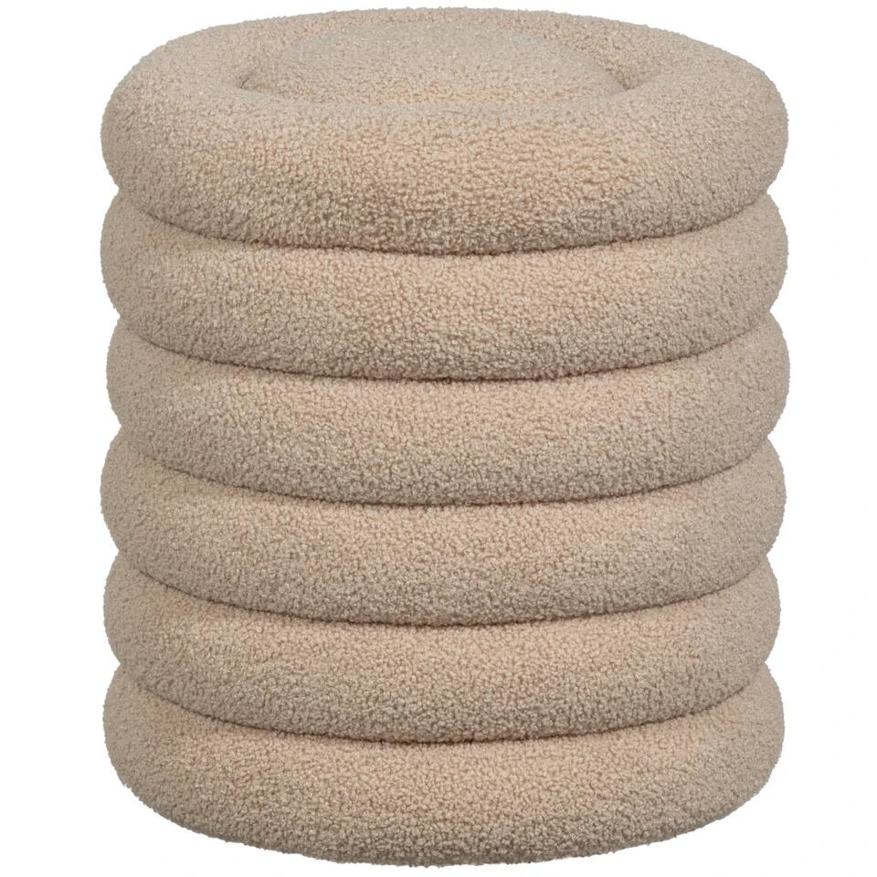 Gestapelde ringen in een zacht, wollig jasje. De Carly poef is een leuke toevoeging voor een romantisch interieur of basic neutrale kinderkamer. De Carly poef komt uit de collectie van het Nederlandse interieurmerk WOOOD en is bekleed met een heerlijk zachte teddystof.